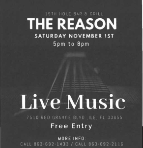 Saturday November 1 The Reason will be playing in the 19th hole dining room. This event is a Free Event. Come out and enjoy some fantastic music and have some dinner.